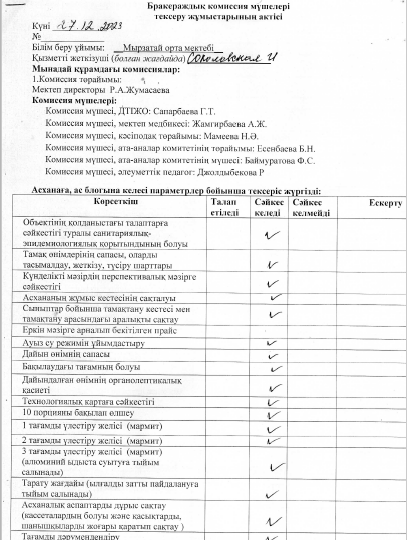Бракераж комиссия мүшелерінің мектеп асханасын тексеруі