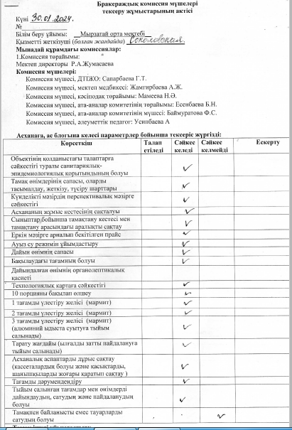 Асхананың санитарлық талапқа сай болуы және оқушылардың ыстық тамаққа баруын тексеру актісі 2