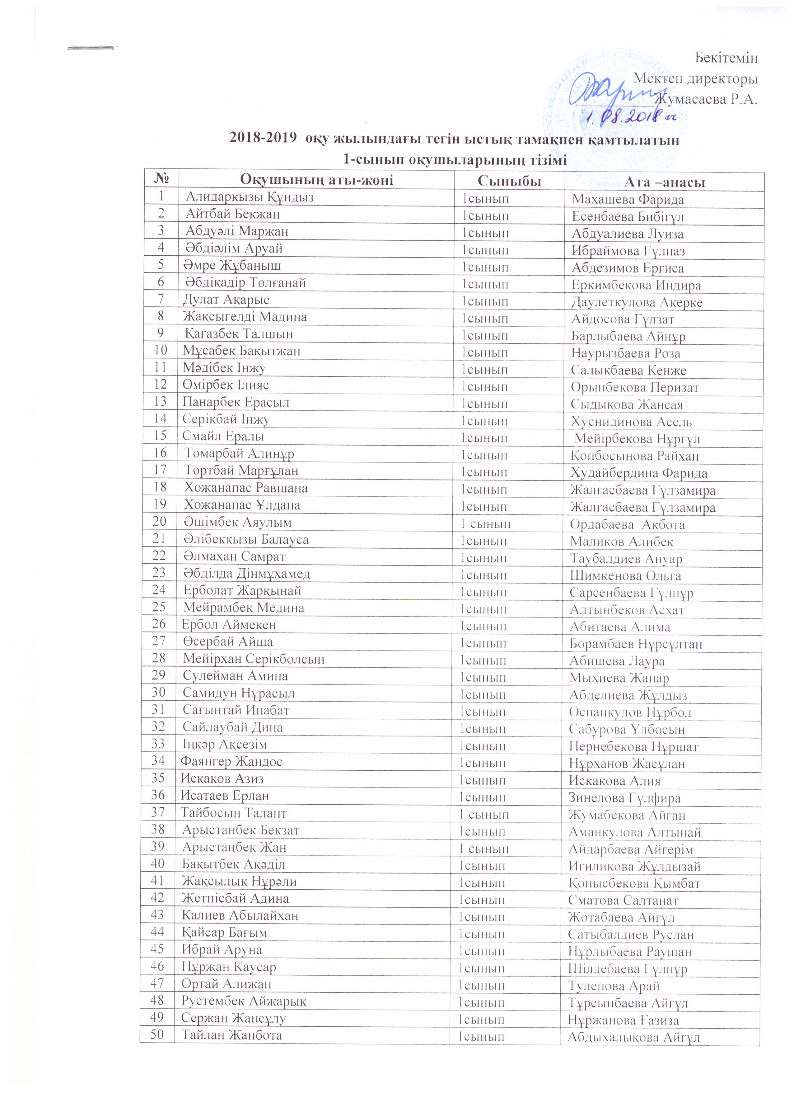 20 ноябрь 2018 0 1 2 3 4 5 2018-2019 оқу жылындағы тегін ыстық тамақпен қамтылатын 1-сынып оқушыларының тізімі.