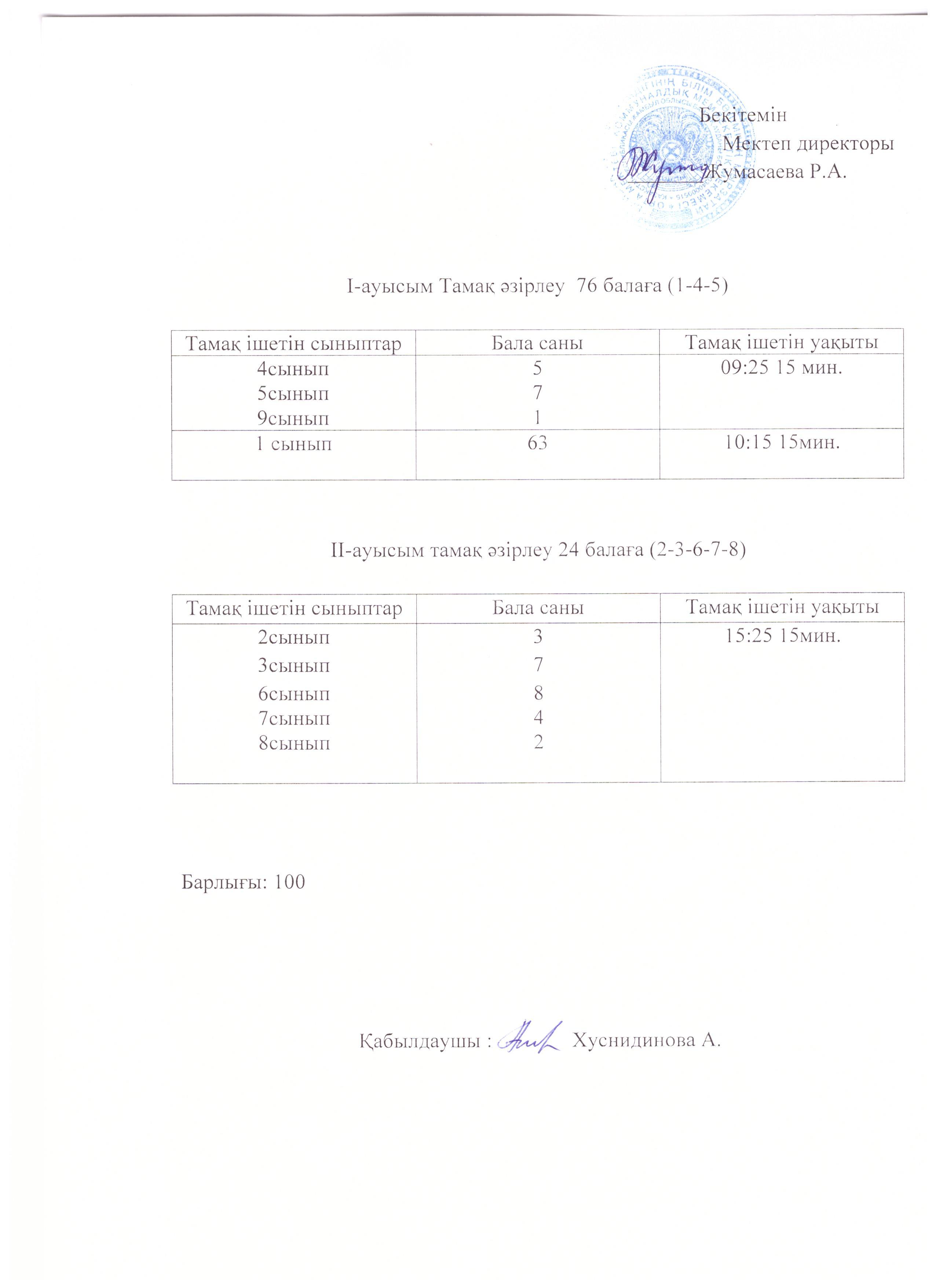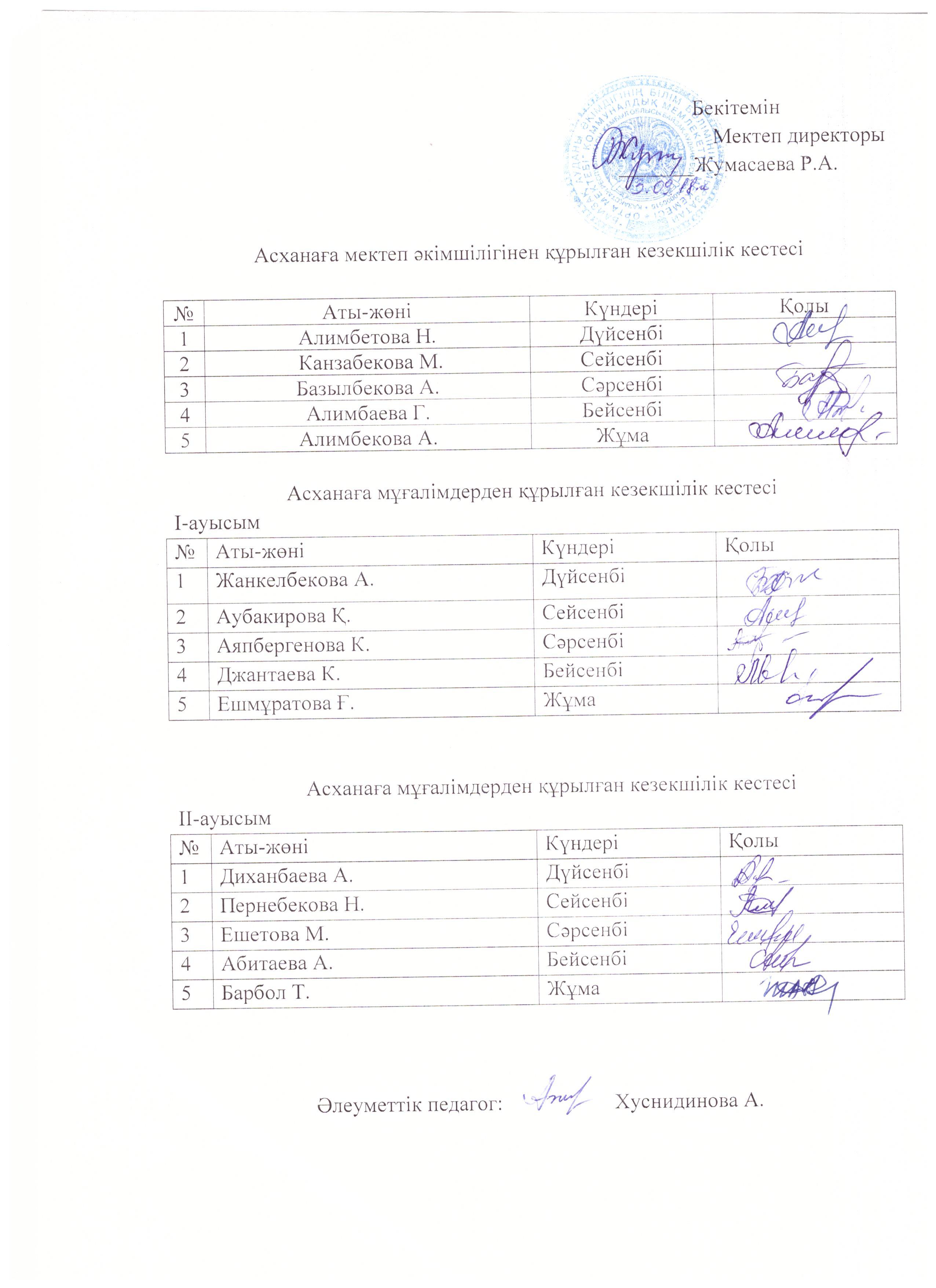 Асханаға мектеп әкімшілігінен құрылған кезекшілік кестесі